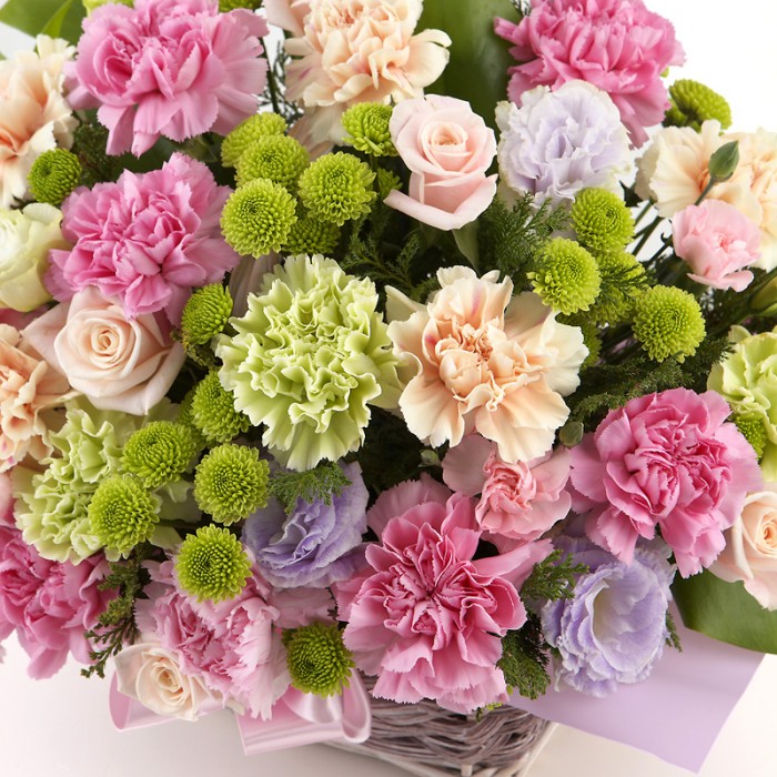 분홍색 파스텔톤 카네이션과 장미로 구성된 꽃바구니입니다.